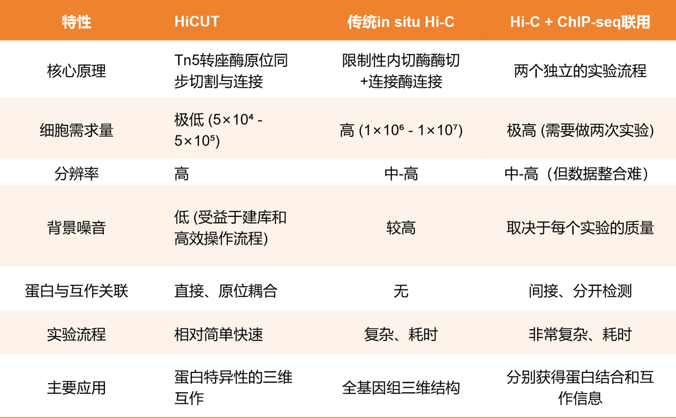 传统的多组学联用方案(如Hi-C + ChIP-seq)需要分别进行两次实验,耗时长、所需细胞量多、数据整合困难。HiCUT一举解决了这些痛点,其优势主要体现在: