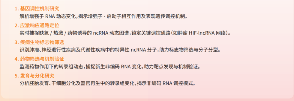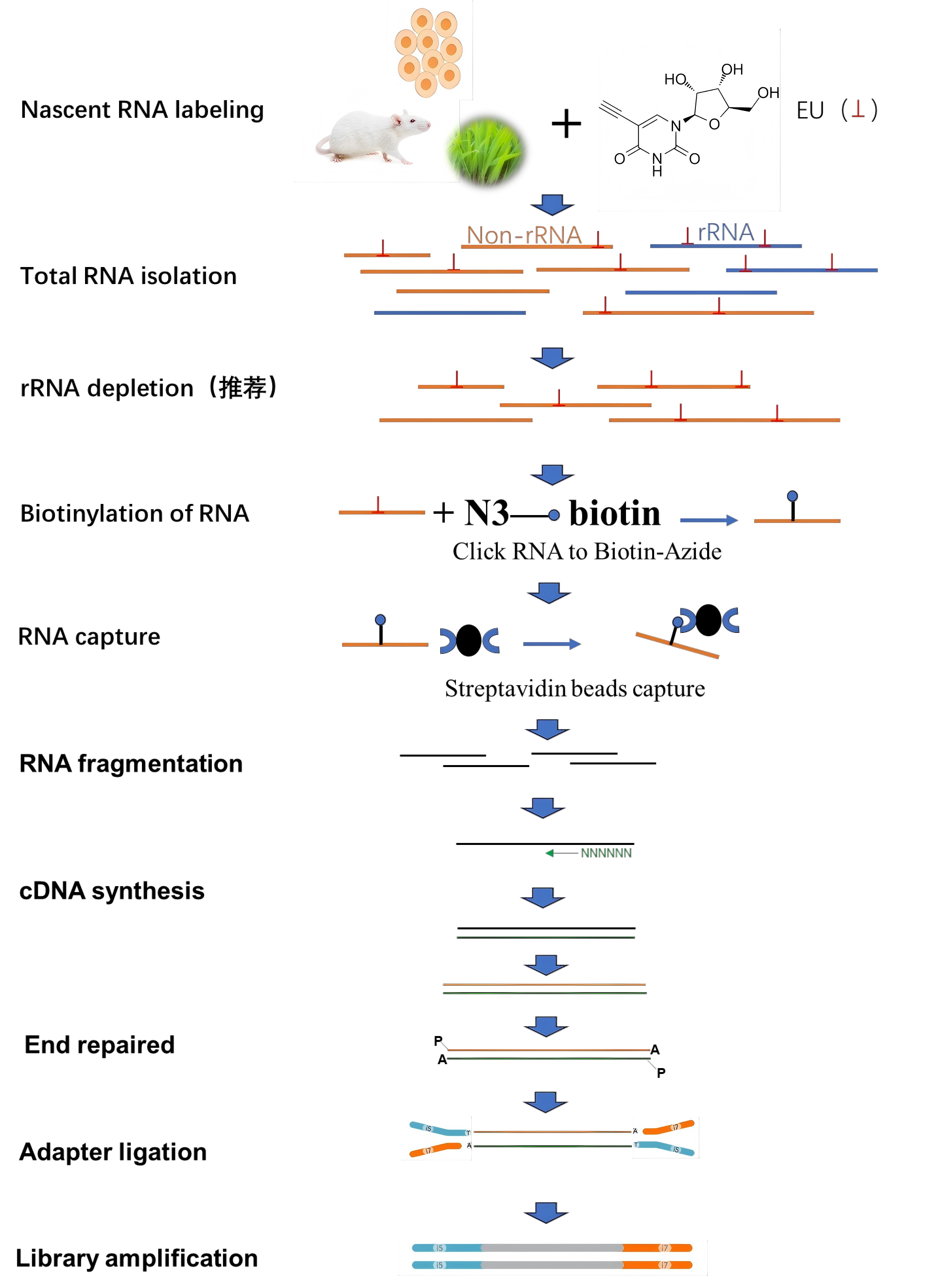 本试剂盒适用于llumina平台的新生RNA转录组文库构建试剂盒,操作简单,建库时间短,效果稳定,适用于活体动物、植物、活细胞等多种类样本的新生RNA文库构建。本试剂盒使用5-乙炔基尿嘧(EU)标记活细胞中的新生RNA,然后通过点击化学反应,使新生的RNA标记上生物素,再通过链霉亲和素磁珠特异性捕获新生的RNA,最后对新生的RNA进行文库构建。结合实验时间设计,能够对新生成的RNA进行定量分析,同时能够研究RNA转录水平和降解问题。